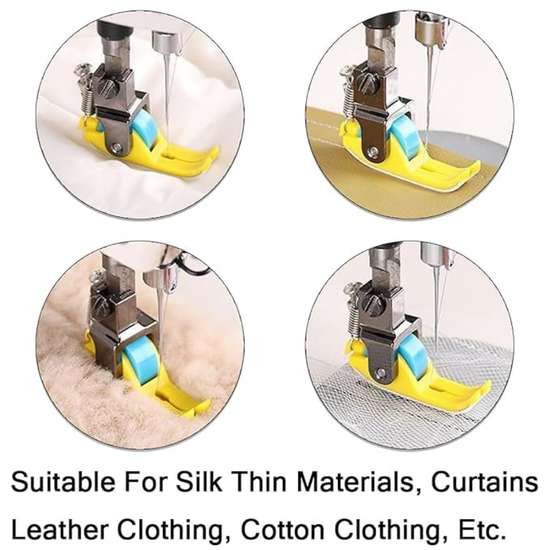 Equipped with a non-stick silicone wheel, this roller foot allows fabric to glide easily without sticking, dragging, or marking the surface. The narrow design provides better visibility and control, making it ideal for edge stitching and detailed work.