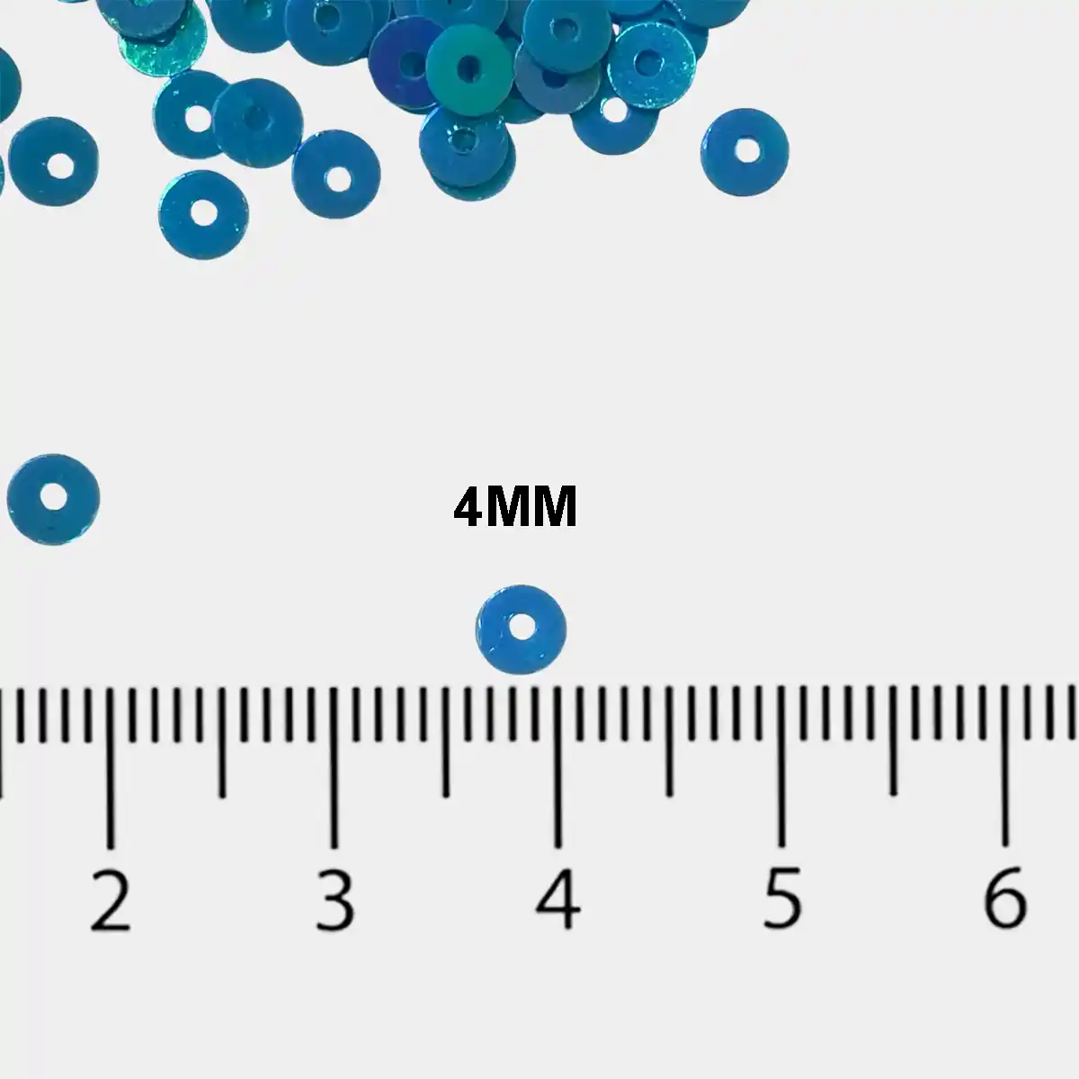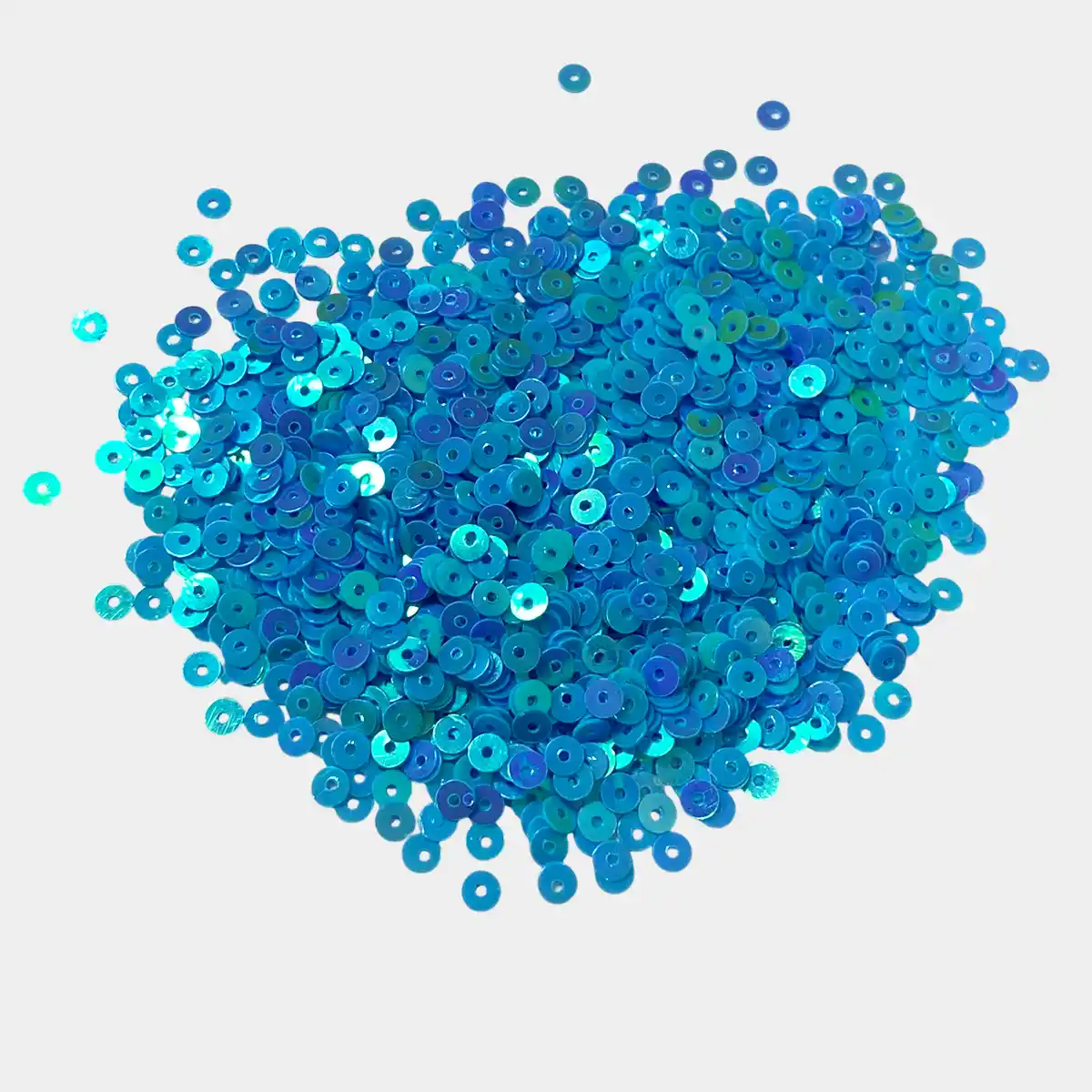 Enhance your designs with these round shape sewing sequins in a beautiful sky blue iridescent rainbow finish. These shiny 4 mm sequins catch the light perfectly, adding an elegant sparkle to embroidery, hand sewing, and craft projects.