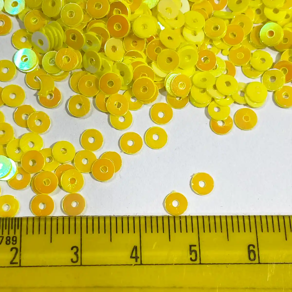 Brighten up your designs with these round shape sewing sequins in yellow iridescent rainbow finish. With a 4 mm size, these shiny sequins reflect light beautifully and add a vibrant sparkle to embroidery and decorative stitching.